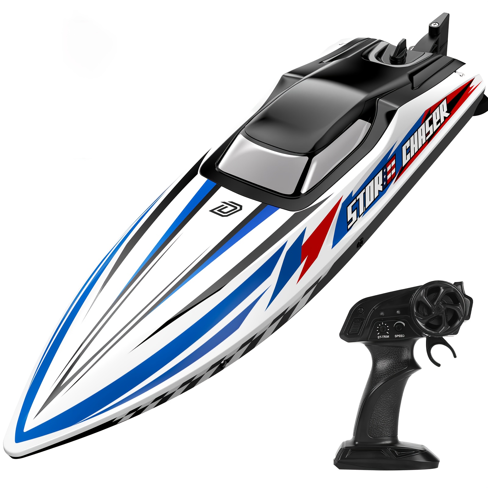 2.4GHz Control-Paired with its bold checkered flag and sleek stripes design, inspired by championship boat racing, this boat turns heads on any lake or waterway. The 2.4GHz remote ensures smooth, interference-free control for exciting multi-boat racing.