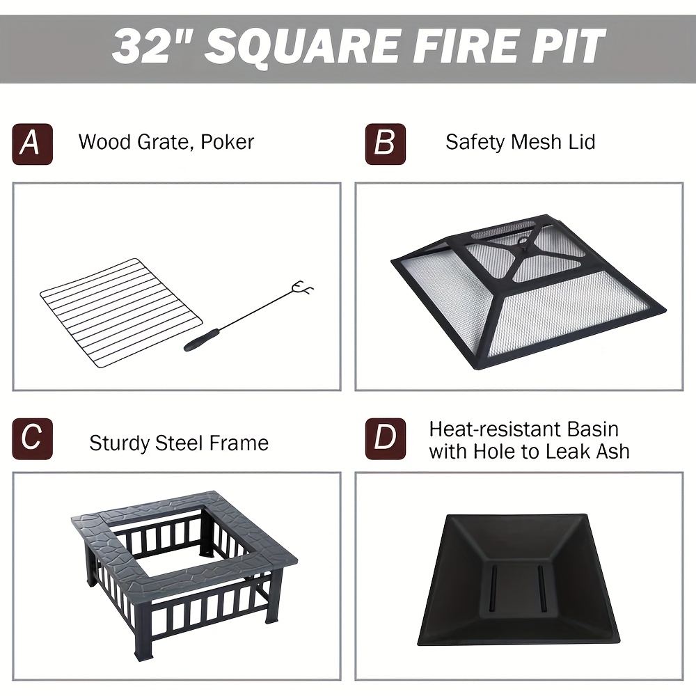 SAFETY PROTECTION: Crafted from heavy-duty steel, this fire pit minimizes safety risks like overturning. It includes a cover to contain embers and a poker for adjusting the fire safely.