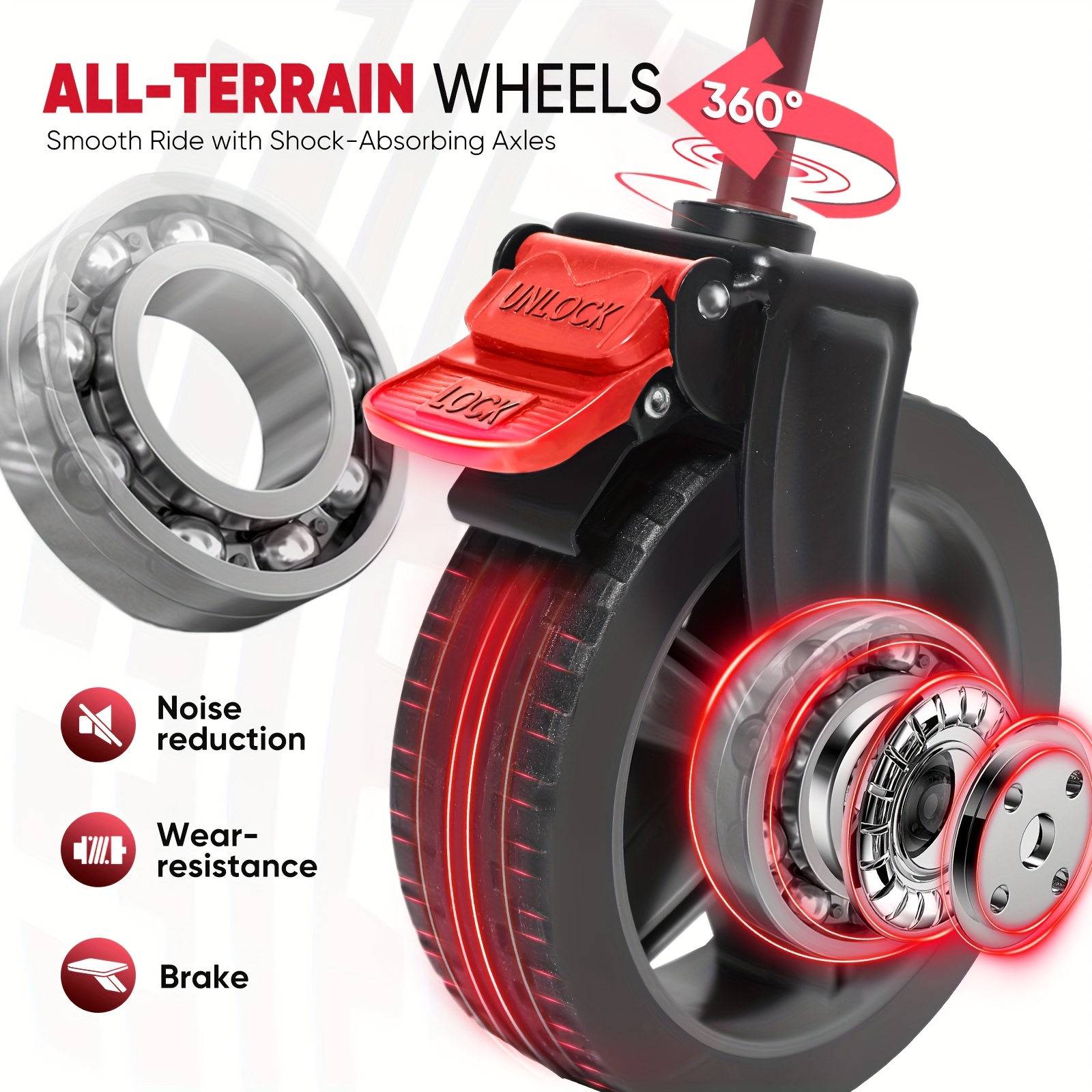 This beach cart features all-terrain wheels that can rotate silently in any direction. The wheels are removable and can be washed, equipped with two brakes and bearings to avoid slipping, even on inclines. It is ideal for various settings including the beach, grassy areas, sandy surfaces, gravel, and muddy terrain.