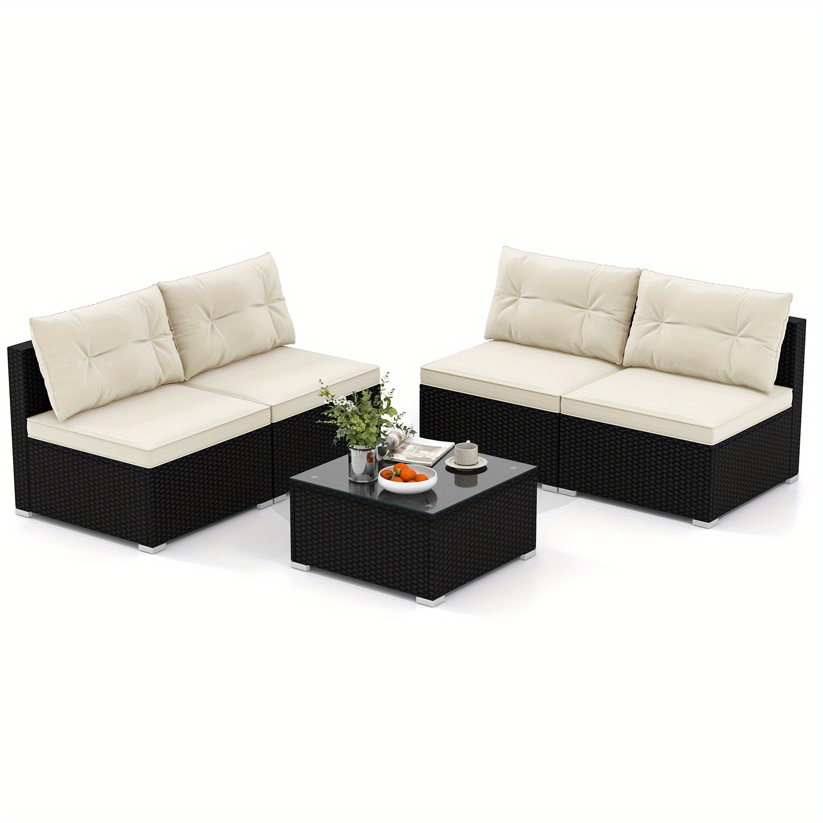 Enhance your outdoor lifestyle with our fantastic 5-piece patio furniture set made of PE rattan! This outdoor seating set includes plush cushions with soft padding, offering an exceptionally cozy sitting experience. The matching coffee table with tempered glass top provides a convenient surface for easy access to your belongings. But wait, there’s more! Additionally, all pieces are constructed from durable and sun-resistant PE rattan, ensuring long-lasting quality and resilience. Moreover, the modular design enables you to personalize your outdoor area according to your preferences and style! Please remember to keep the cushions dry to extend their lifespan.