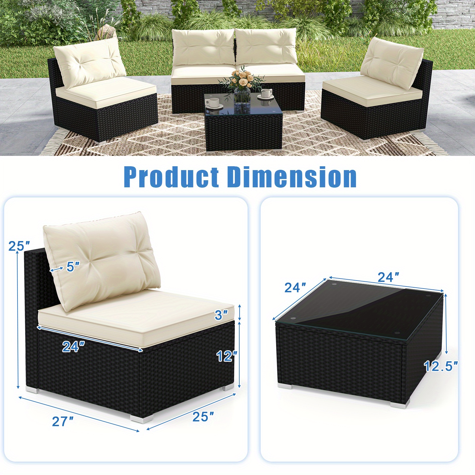The rattan color is black, while the cushion color is off white. The materials used are PE rattan, tempered glass, metal, polyester, and sponge. Each chair measures 27″ x 25″ x 25″ (L x W x H), the coffee table measures 24″ x 24″ x 12.5″ (L x W x H), the seat cushion measures 25″ x 24″ x 3″ (L x W x Thickness), and the back cushion measures 25.5″ x 14.5″ x 5″ (L x W x Thickness). The seat height is 12″ and the seat depth is 24″. The total net weight is 96 lbs. Each chair has a weight capacity of 400 lbs, while the coffee table can hold up to 180 lbs. The package includes 4 armless sofas, 4 seat cushions, 4 back cushions, 1 coffee table, and 1 instruction manual.