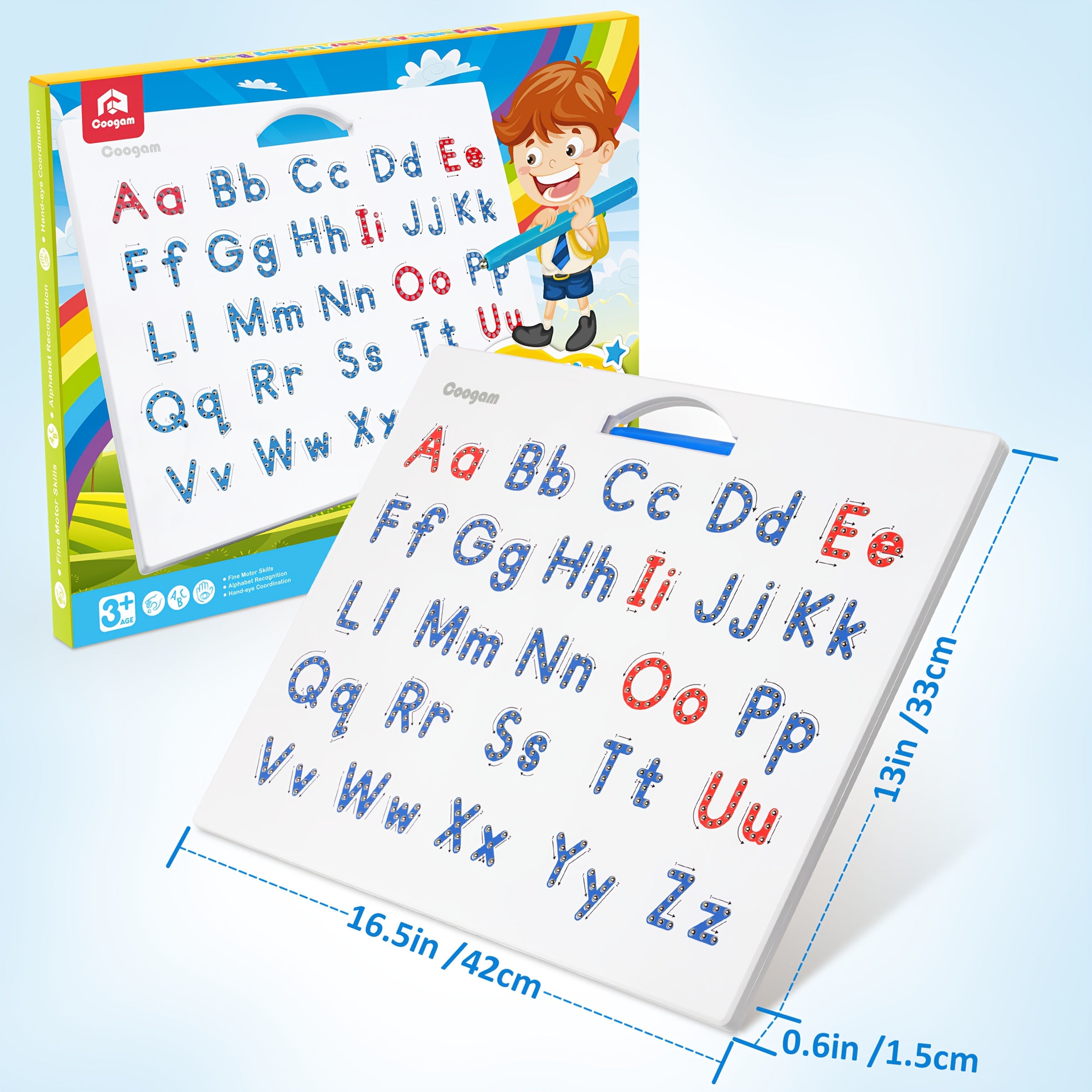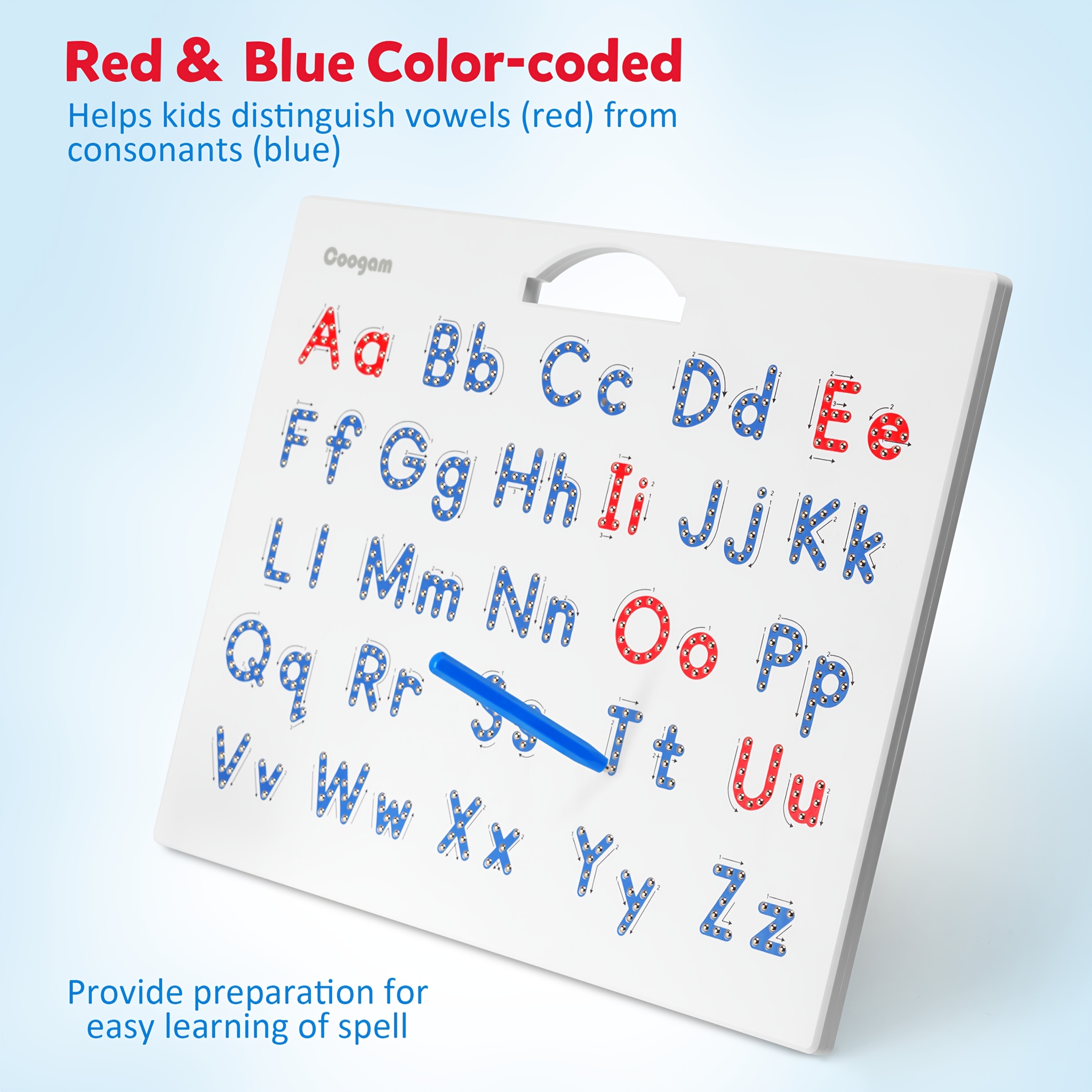 Magnetic ABC Tablet: Discover letters visually using the Coogam magnetic alphabet tracing board! It features a large font, is made from durable materials, and the compact writing pad includes both uppercase and lowercase letters in a single board, eliminating the need for two separate ones, along with a magnetic stylus for tracing.