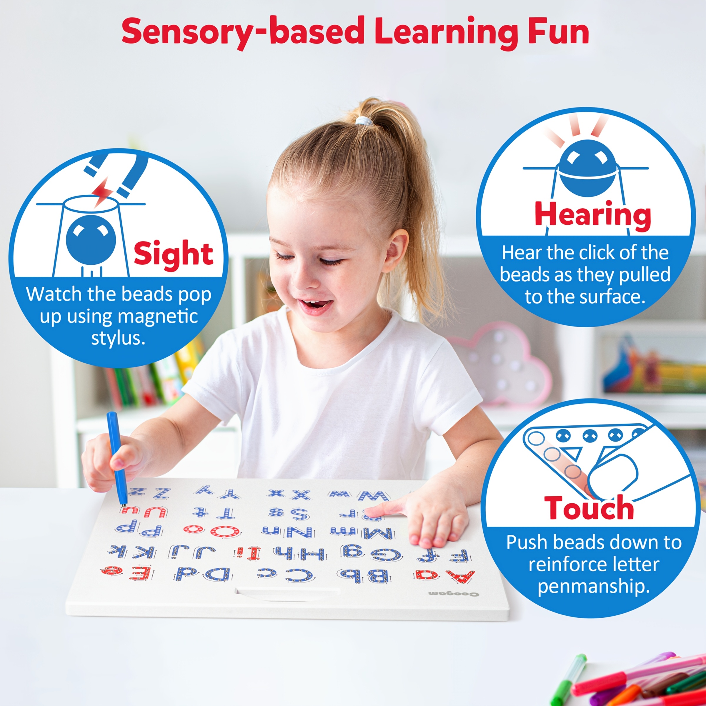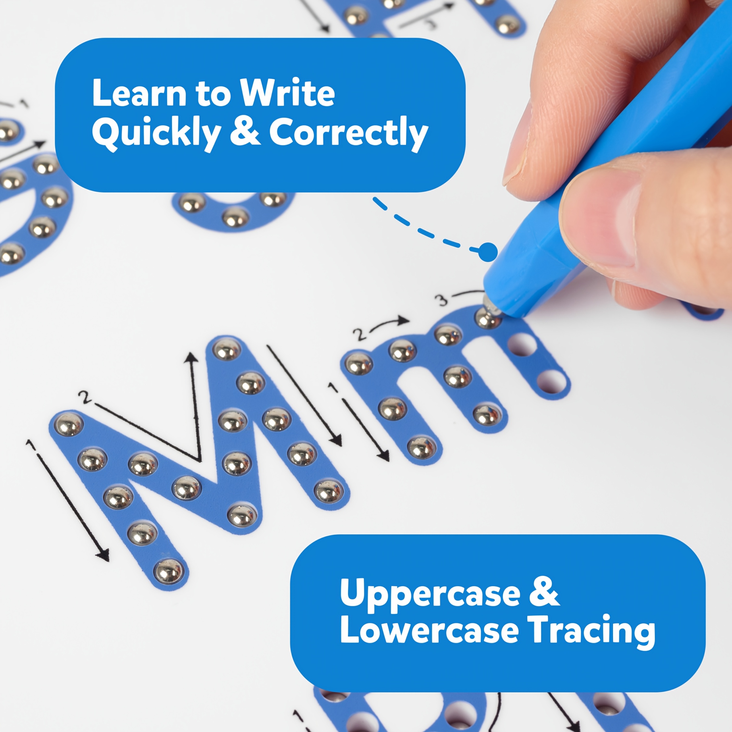 This is an excellent resource for enhancing muscle memory in letter writing, providing guidance on how to form each letter, and reviewing the alphabet! The magnetic writing board allows for tracing repeatedly by just wiping the beads with a pen or hand. It’s a sturdy product designed for long-lasting use and can be utilized multiple times.