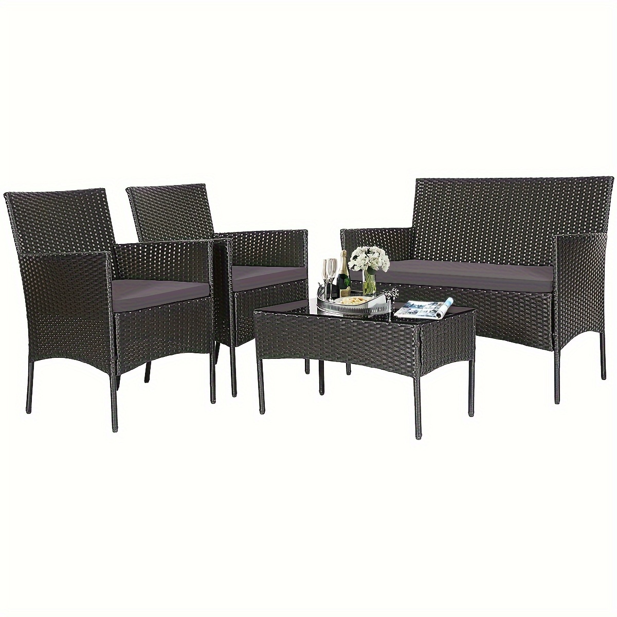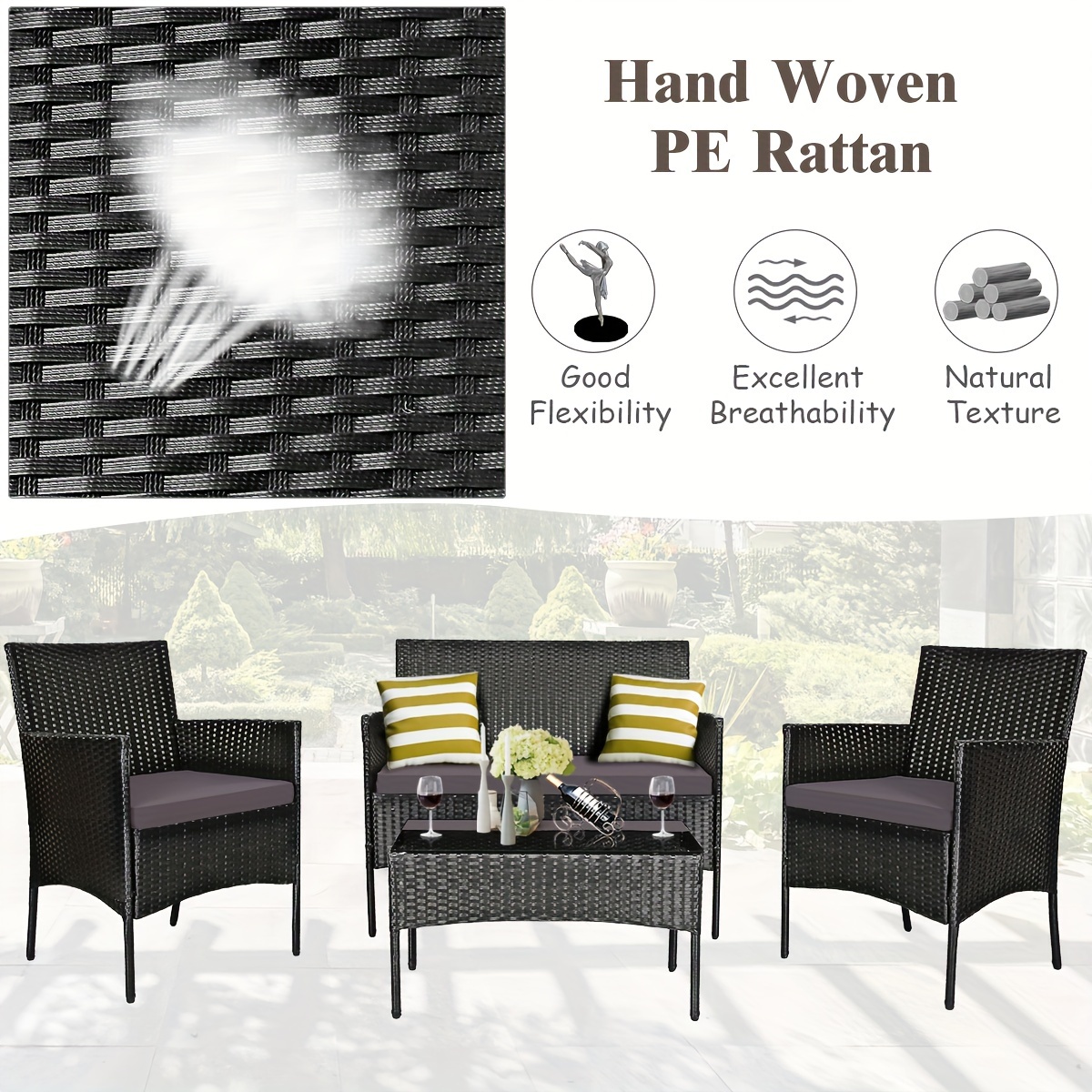 Our practical 4 pieces patio furniture sets provides a leisure zone for you and your family or friends to enjoy a cool outdoor time. The set is made of all weather PE rattan and steel frame, which ensure the durability and sturdiness for long servicing life. This set includes a loveseat, a table and two single chairs that can be combined randomly according to requirements. Besides, the removable and washable seat cushions with zipper are also included in your package.