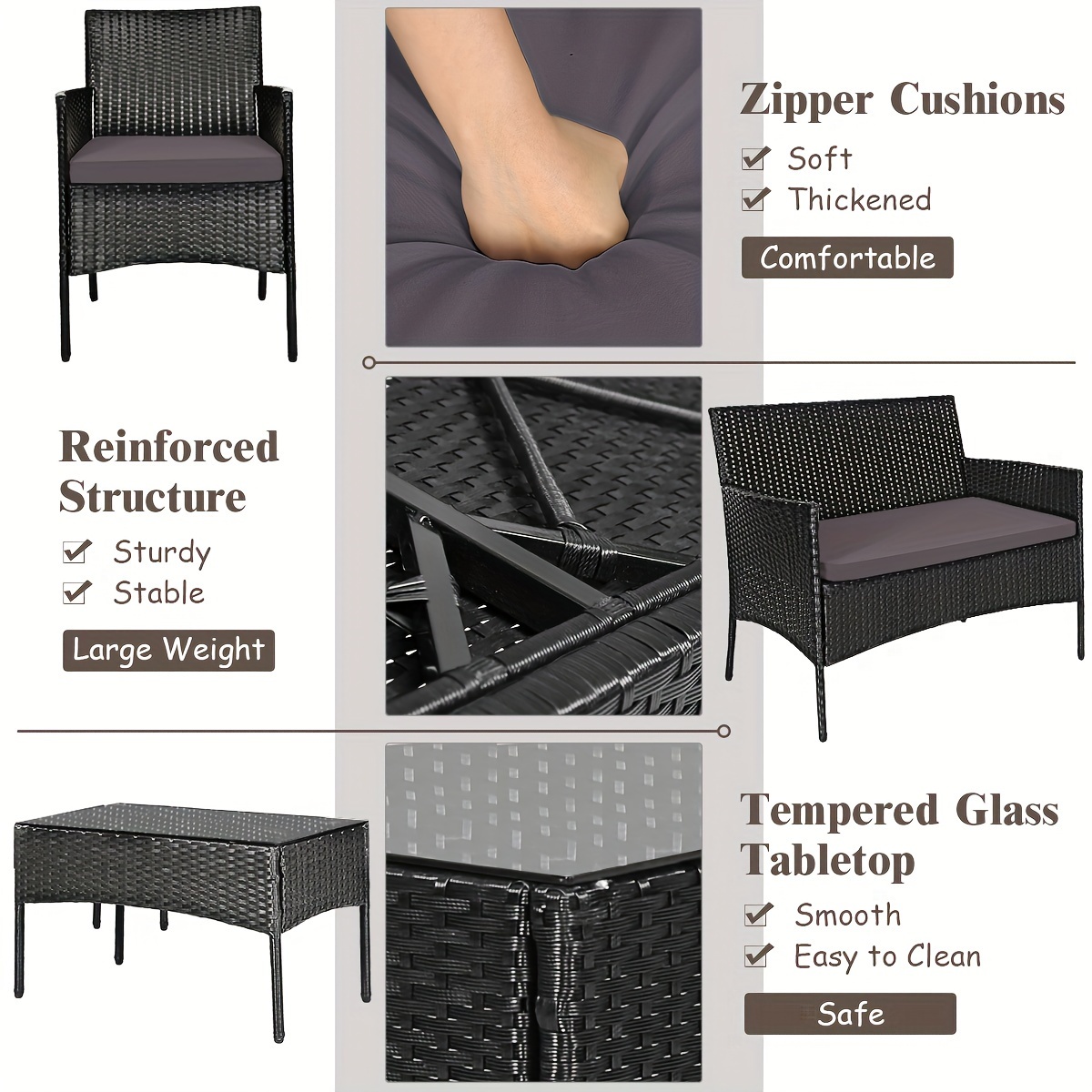 Material: PE Rattan, Steel, Tempered Glass, Polyester fabric, sponge