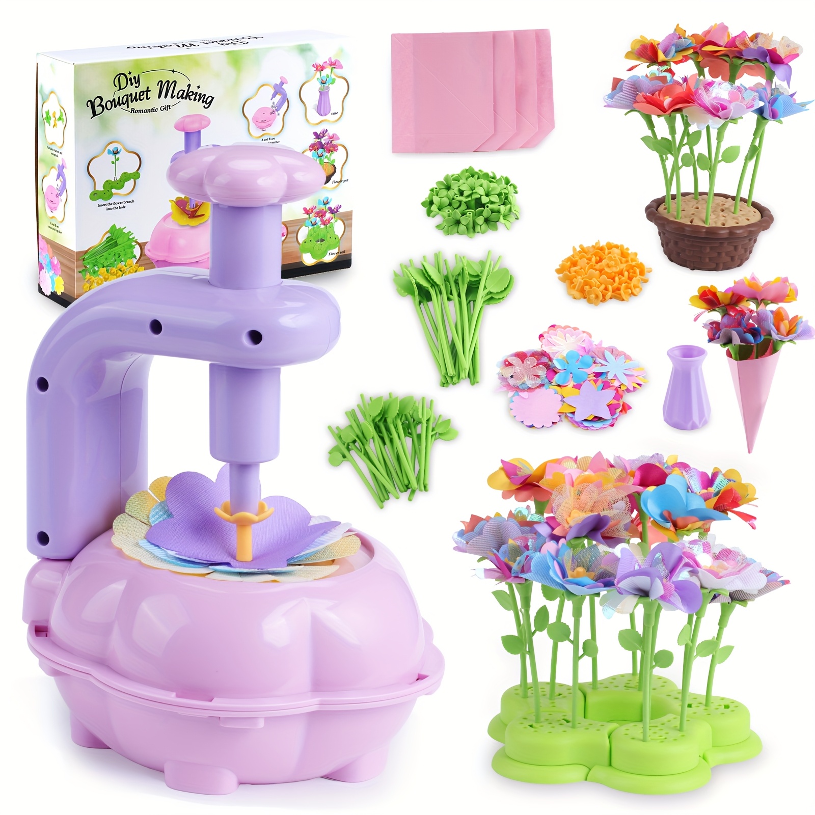 DIY Flower Bouquet Kit: This kit comes with a flower-making toy. The package contains 14 different types of 108 interchangeable flower parts, allowing you to create 36 complete flowers (each made up of 3 parts), 36 flower centers, 36 holders for the flowers, 18 long stems, 18 short stems, 2 types of bases for arrangements, 1 vase, and 4 sheets of wrapping paper for bouquets.