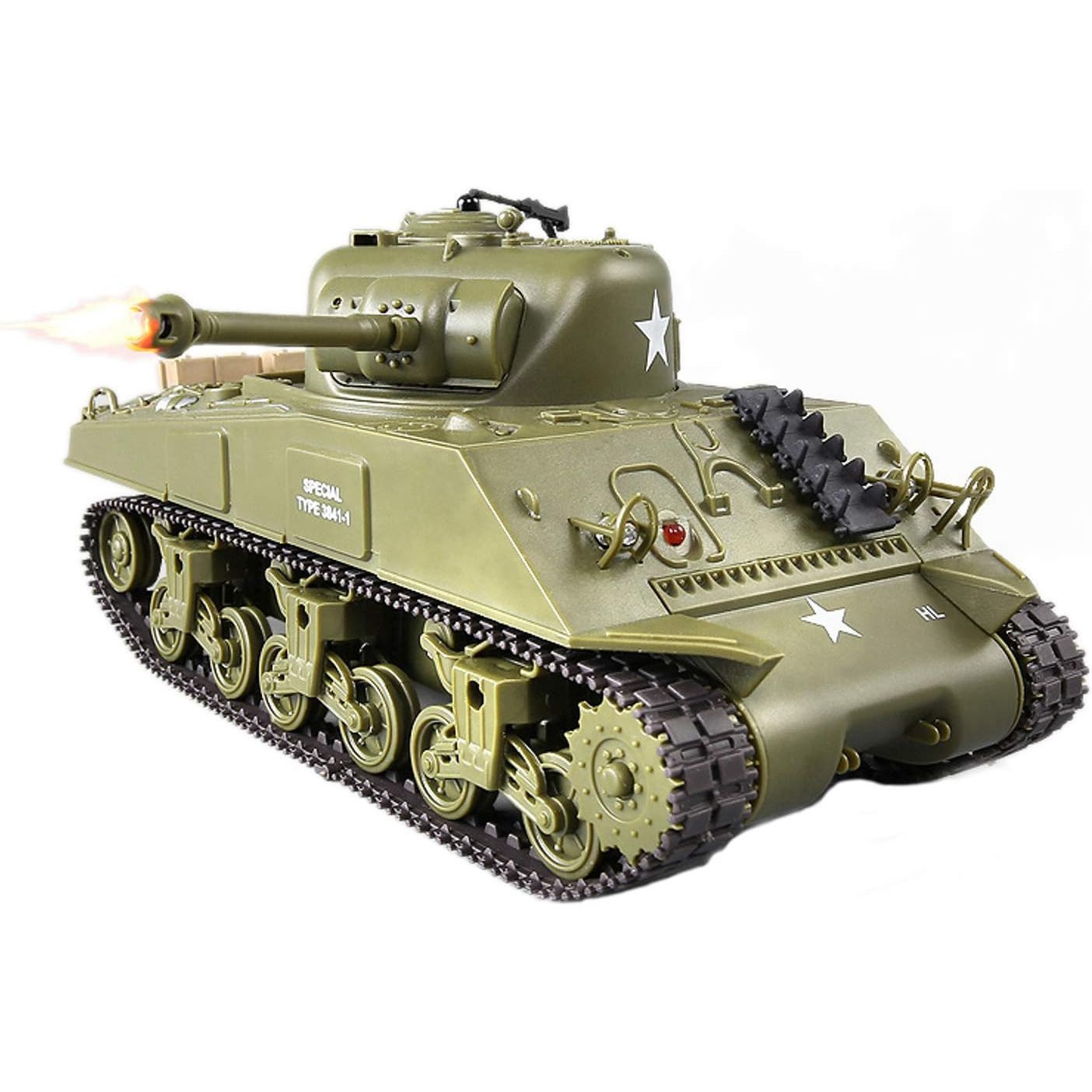 Features: Replica of M4A3 Sherman Easy Eight WWII US Medium Tank at 1/30 Scale Vital Force 4 LED Indicator for Tank Battle Simulative Motor start-up sound, Engine Sound, Machine-gun Sound Movements: Forward/Backward, Left/Right turn, and Spin Realistic firing sounds and recoil action when cannons fire Working Front LED Lights